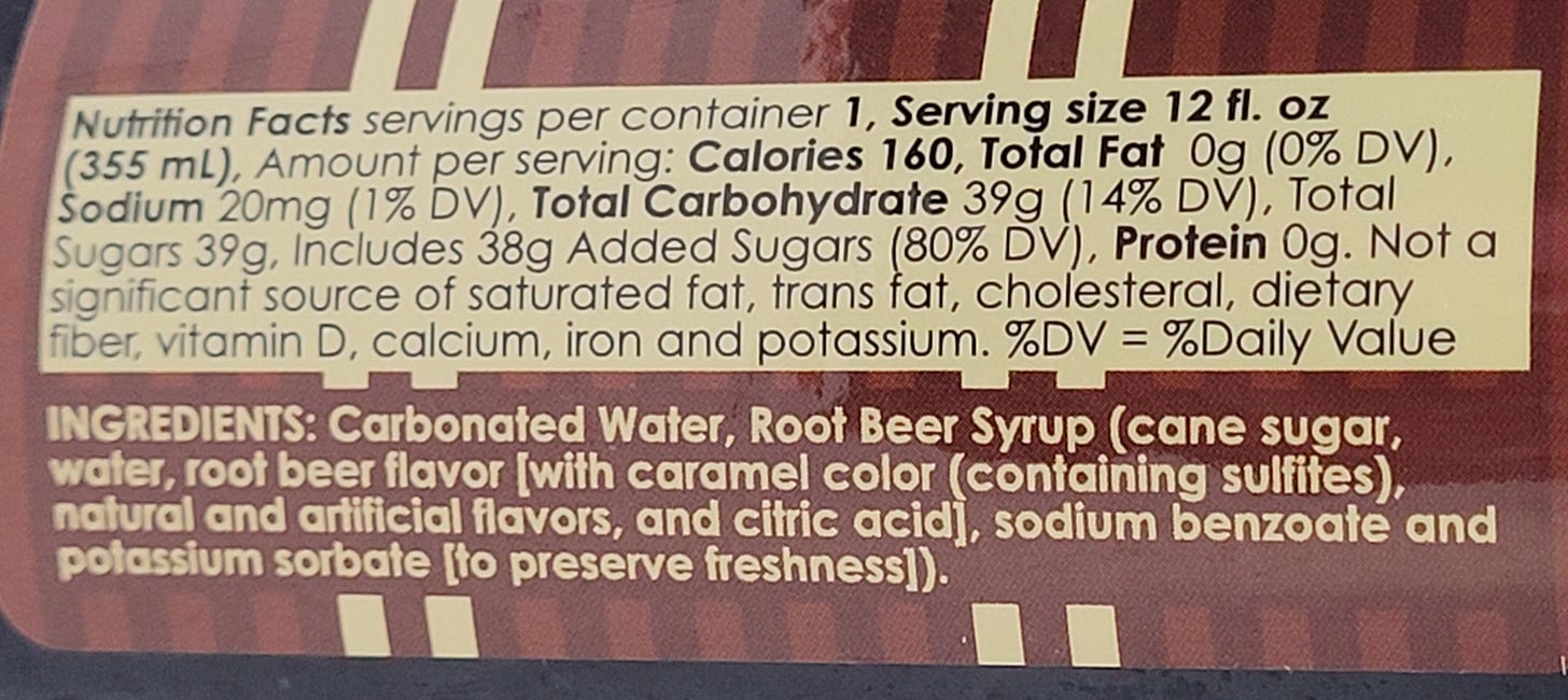 In general, I would call this fairly bland. This is the first root beer I have had that mentions containing “Root Beer Syrup”. On the plus side, they use cane sugar at least.